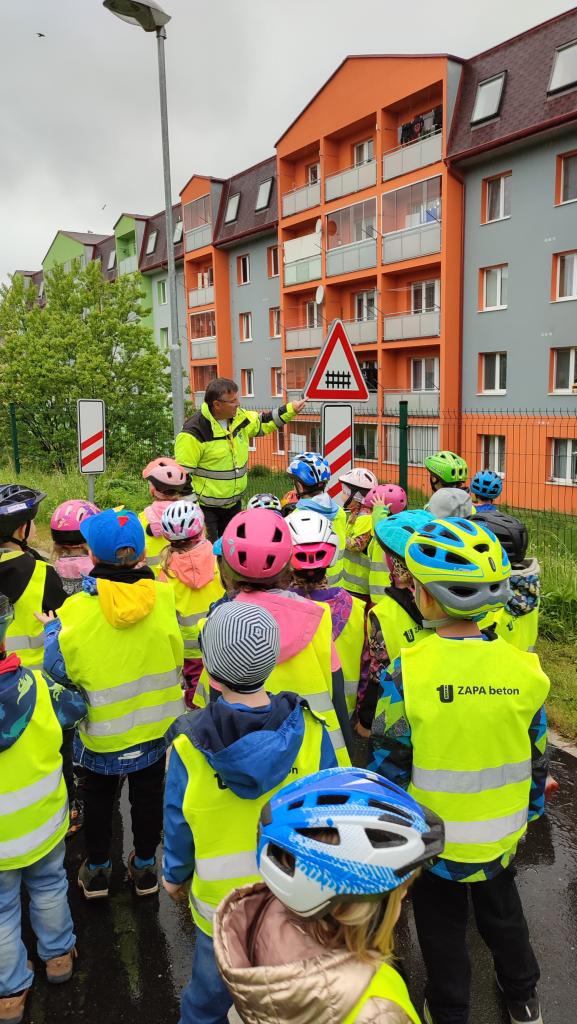 Děti si nejprve rozšířily své znalosti o bezpečnosti v silničním provozu, kde se dozvěděly jak se mají správně chovat jako chodci, poznávaly důležité dopravní značky, situace. Snad příště nám bude přát počasí a budeme si moci hřiště užít naplno i s jízdními prostředky.