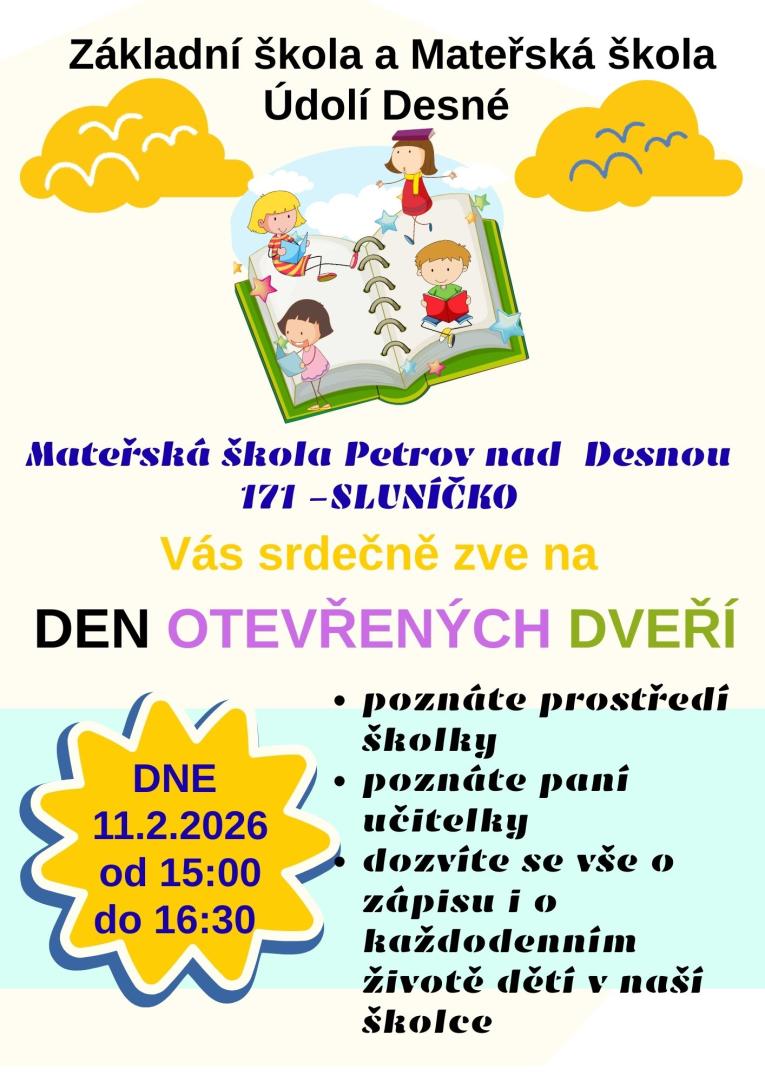 Termín přijímacího řízení na školní rok 2026/2027 je stanoven na 31. 3. 2026 od 9.30 -11.30 hodin a 13.00 – 16.30 hodin na všech mateřských školách ZŠ a MŠ Údolí Desné. Všechny MŠ v obcích svazkové školy jsou „spádové“.