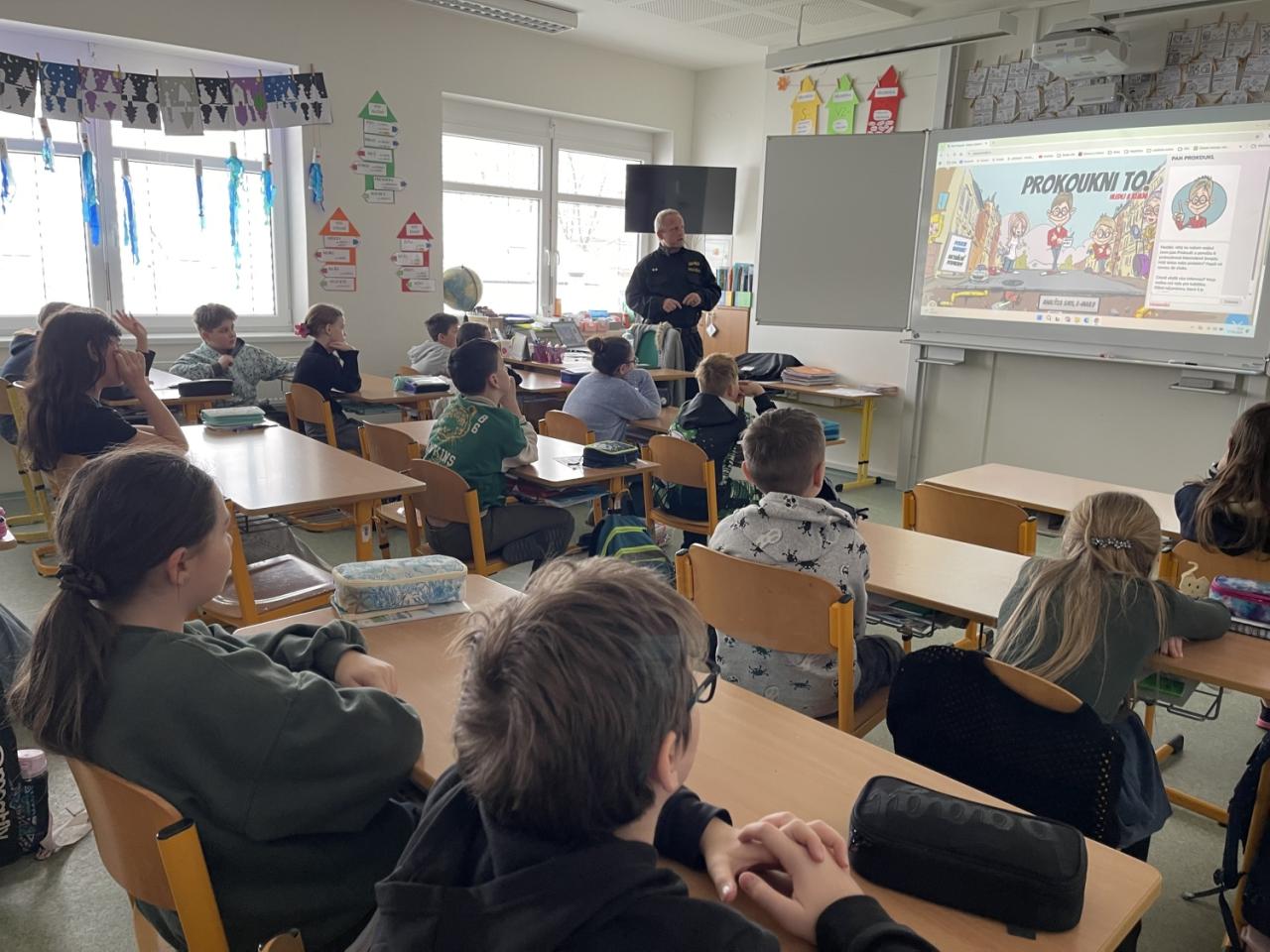Páťáci se věnovali tématu, které je pro dnešní dobu mimořádně důležité – bezpečnosti na internetu. Pan Policista s dětmi mluvil o tom, jak rozpoznat rizikové chování na sociálních sítích, proč je důležité chránit své osobní údaje, jak reagovat na kyberšikanu a jak se bezpečně pohybovat v online hrách či komunikaci.